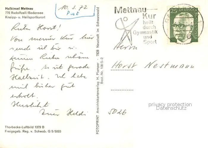 Radolfzell_Bodensee Halbinsel Mettnau Fliegeraufnahme Radolfzell Bodensee postalisch gelaufen 1972 Erhaltung siehe scans [FriedD77] Frierer