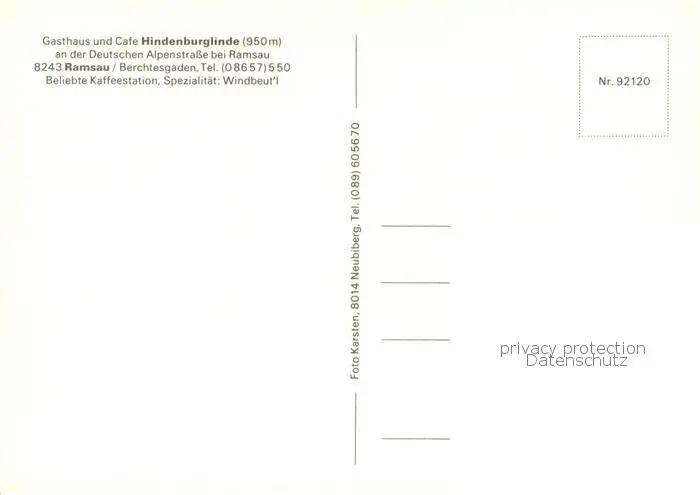 Ramsau_Berchtesgaden Gasthaus Café Hindenburglinde an der Deutschen Alpenstrasse Windbeutel Ramsau Berchtesgaden postalisch nicht gelaufen nach 1965 Erhaltung siehe scans [FriedD77] Frierer