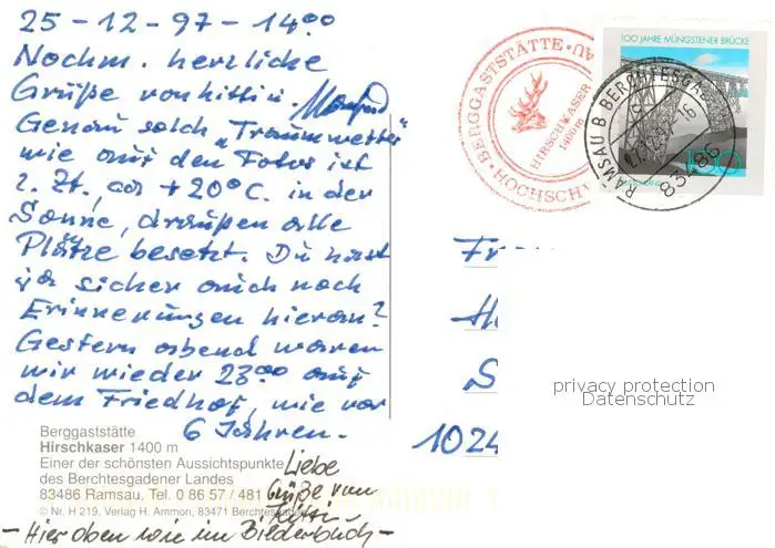 Ramsau_Berchtesgaden Rundblick vom Hirscheck Panorama Berggaststaette Hirschkaser Ramsau Berchtesgaden postalisch gelaufen 1997 Erhaltung siehe scans [WerneD78] WernPID7