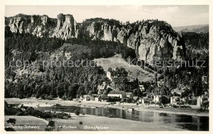 Rathen_Saechsische Schweiz Blick ueber die Elbe zum Gansfelsen Elbsandsteingebirge Rathen Saechsische Schweiz postalisch nicht gelaufen 1921-1965 Erhaltung siehe scans [FriedD77] Frierer