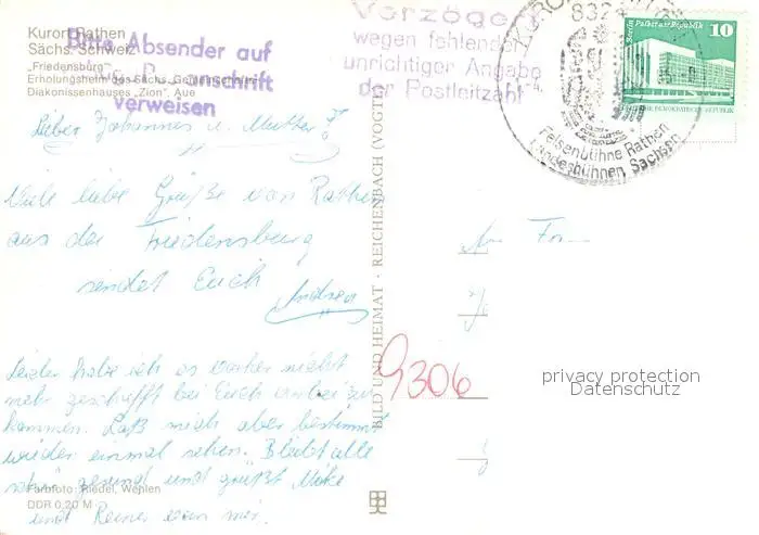 Rathen_Saechsische Schweiz Friedensburg Erholungsheim Rathen Saechsische Schweiz postalisch gelaufen 1985 Erhaltung siehe scans [FriedD77] Frierer
