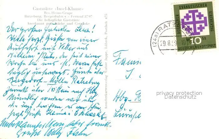 Ratzeburg Gaststaette Insel Klause Strand Ratzeburg postalisch gelaufen 1959 Erhaltung siehe scans [WerneD78] WernPID7