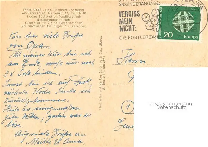 Ratzeburg Kategorie Alte Ansichtskarten Postkarten bx89727 Ratzeburg Insel Cafe Gastraum Verkaufstheke Ratzeburg postalisch gelaufen 1970 Erhaltung siehe scans [FriedD77]