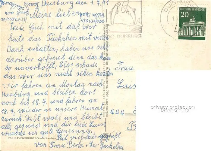 Ravensburg_Wuerttemberg Stadtbild mit Mehlsack und Obertor Blick von der Veitsburg Blaserturm Wappen Ravensburg Wuerttemberg postalisch gelaufen 1971 Erhaltung siehe scans [FriedD77] Frierer