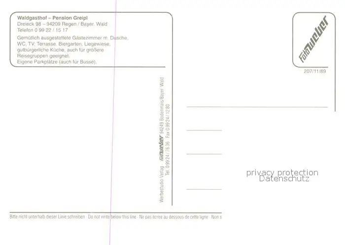 Regen Waldgasthof Pension Greipl im Bayerischen Wald Restaurant Regen postalisch nicht gelaufen 1998 Erhaltung siehe scans [FriedD77] Frierer