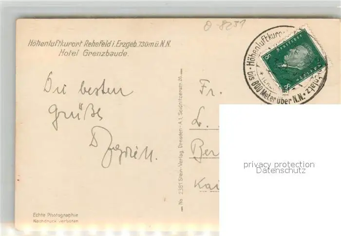 Rehefeld-Zaunhaus Hotel Grenzbaude Hoehenluftkurort Erzgebirge Rehefeld-Zaunhaus postalisch gelaufen 1930 Erhaltung siehe scans [FriedD77] Frierer