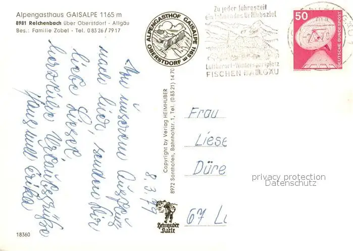 Reichenbach_Oberstdorf Alpengasthaus Gaisalp Schnee Winter Entschenkopf Nebelhorn Reichenbach_Oberstdorf postalisch gelaufen 1979 Erhaltung siehe scans [LiesaD40] LiesID40