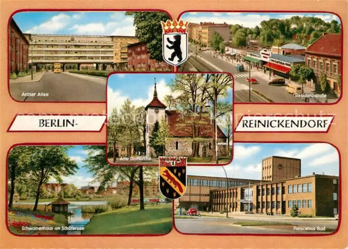 AK / Ansichtskarte Reinickendorf Aroser Allee Residenzstrasse Schwanenhaus Schaefersee Paracelsus Bad Alte Dorfkirche Reinickendorf