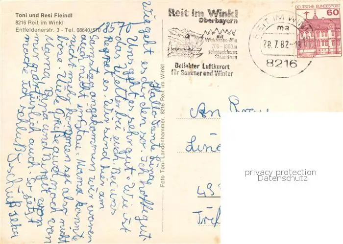 Reit_Winkl Gaestehaus Toni und Resi Fleindl Reit_Winkl postalisch gelaufen 1982 Erhaltung siehe scans [FriedD77] Frierer