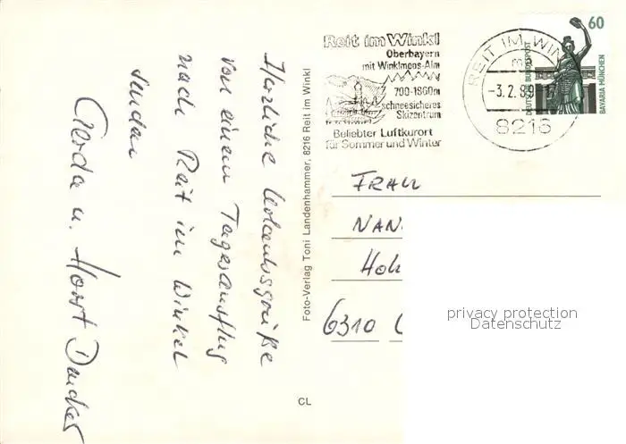 Reit_Winkl Winterlandschaft Wintersportplatz Langlaufloipe Pferdeschlitten Alpenpanorama Reit_Winkl postalisch gelaufen 1989 Erhaltung siehe scans [FriedD77] Frierer