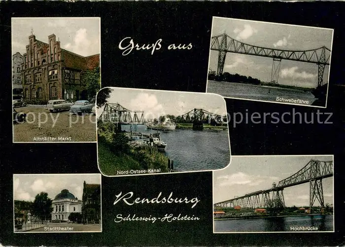 AK / Ansichtskarte Rendsburg Altstaedter Markt Stadttheater Nord Ostsee Kanal Schwebefaehre Hochbruecke Rendsburg