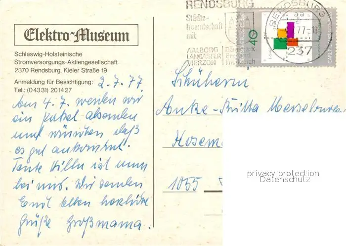 Rendsburg Elektro Museum Rendsburg postalisch gelaufen 1977 Erhaltung siehe scans [FriedD77] Frierer