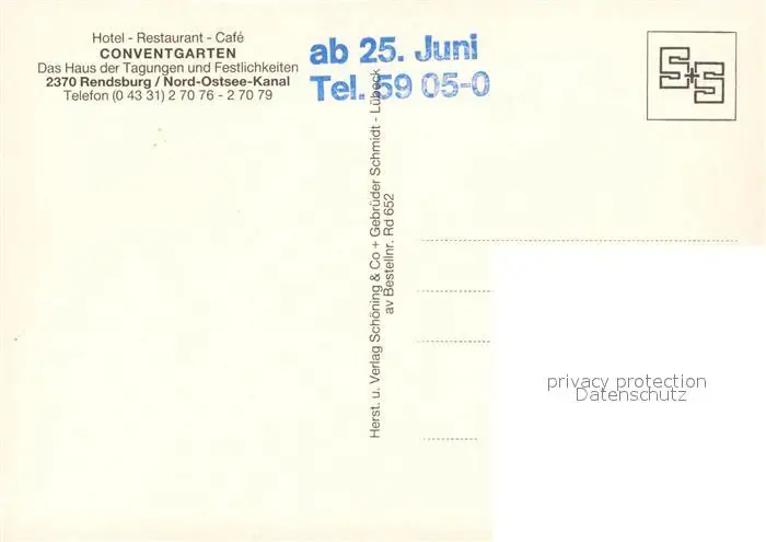 Rendsburg Hotel Restaurant Cafe Conventgarten Nord Ostsee Kanal Rendsburg postalisch nicht gelaufen nach 1965 Erhaltung siehe scans [FriedD77] Frierer