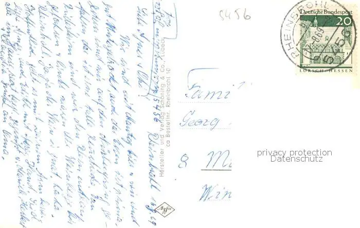 Rheinbrohl Panorama Kath Kirche Teilansicht Rheinanlagen Schloss Rheineck Rheinbrohl postalisch gelaufen 1969 Erhaltung siehe scans [WerneD78] WernPID7