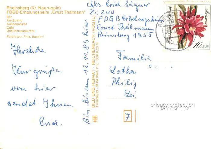 Rheinsberg FDGB Erholungsheim Ernst Thaelmann Bar Cafe Restaurant Strand Rheinsberg postalisch gelaufen 1990 Erhaltung siehe scans [FriedD77] Frierer