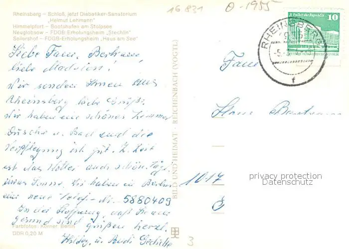 Rheinsberg Schlo? Diabetiker-Sanatorium-Helmut-Lehmann Himmelpfort Bootshafen am Stolpsee Neuglobsow Erholungsheim-Stechlin Seilerhof Erholungsheim-Haus-am See Rheinsberg postalisch gelaufen nach 1965 Erhaltung siehe scans [LiesaD40] LiesID40