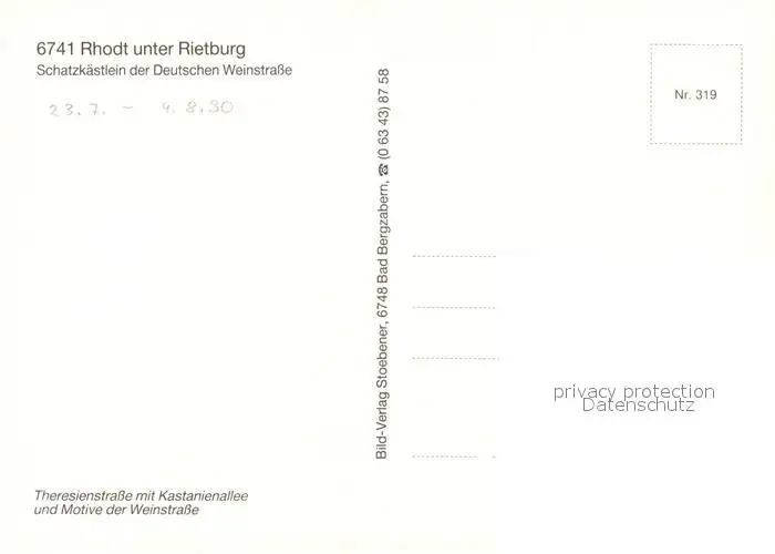 Rhodt_Rietburg Theresienstrasse Kastanienallee Weinfass Staedtepatenschaften Rhodt Rietburg postalisch nicht gelaufen nach 1965 Erhaltung siehe scans [KathaD81] Kathoren