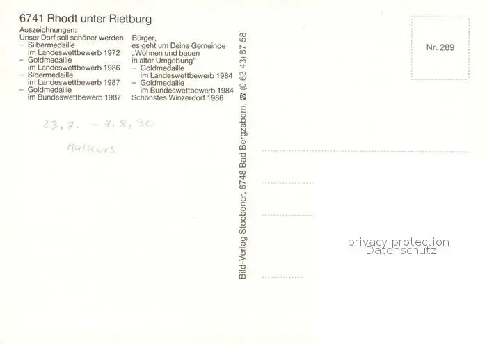 Rhodt_Rietburg Urkunde Unser Dorf soll schoener werden Goldmedaille Silbermedaille Rhodt Rietburg postalisch nicht gelaufen nach 1965 Erhaltung siehe scans [KathaD81] Kathoren