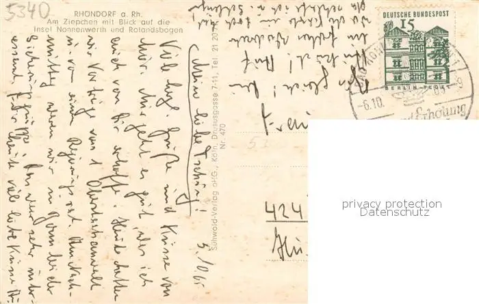 Rhoendorf Am Ziepchen mit Insel Nonnenwerthund Rolandsbogen Rhoendorf postalisch gelaufen 1965 Erhaltung siehe scans [WerneD78] WernPID7