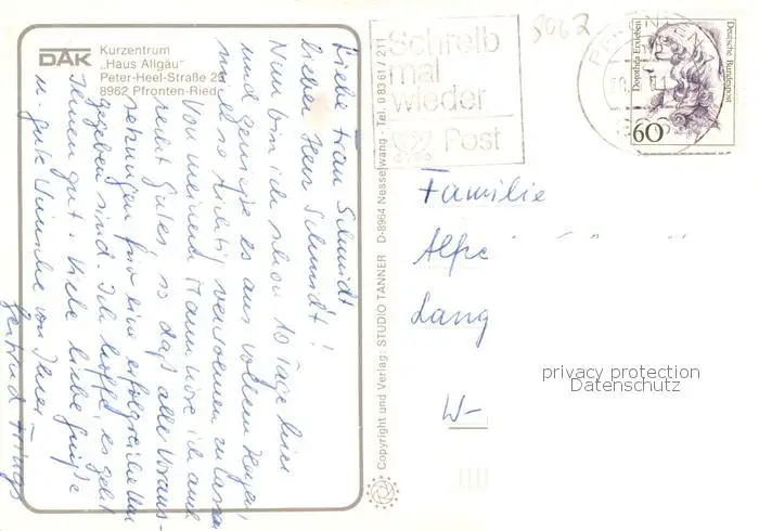 Ried_Pfronten DAK Kurzentrum Haus Allgaeu Alpen Ried Pfronten postalisch gelaufen 1991 Erhaltung siehe scans [FriedD77] Frierer