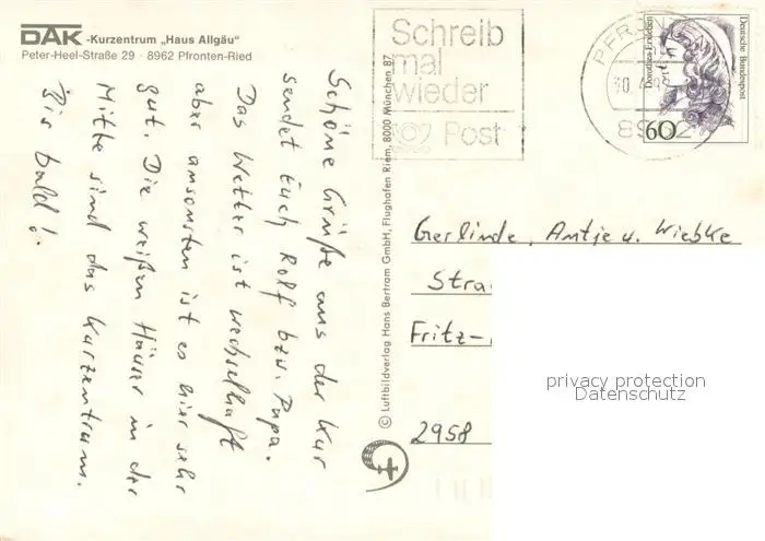 Ried_Pfronten DAK Kurzentrum Haus Allgaeu Fliegeraufnahme Ried Pfronten postalisch gelaufen 1992 Erhaltung siehe scans [WerneD78] WernPID7