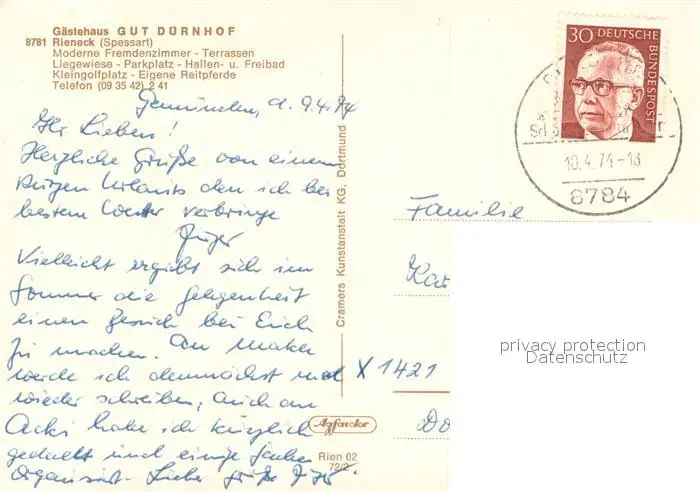 Rieneck Gaestehaus Gut Duernhof Schwimmbad Pferdekoppel Angeln Minigolf Spielplatz Reiten Rieneck postalisch gelaufen 1974 Erhaltung siehe scans [WerneD78] WernPID7