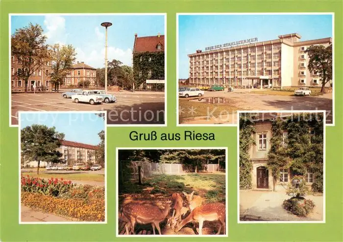 Riesa_Sachsen Leninplatz Haus der Stahlwerker Greiswalder Strasse Tierpark Rathaus Riesa Sachsen postalisch nicht gelaufen 1990 Erhaltung siehe scans [FriedD77] Frierer