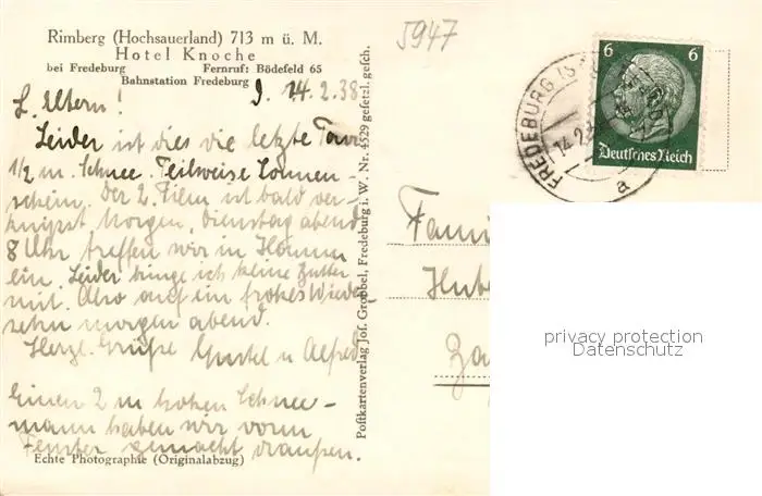 Rimberg_Schmallenberg Hotel Knoche Rimberg_Schmallenberg postalisch gelaufen 1938 Erhaltung siehe scans [PaolaD17] PaolPID1