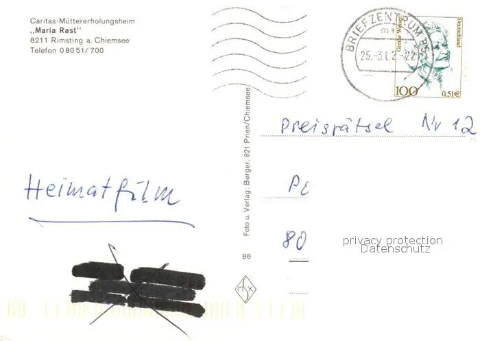 Rimsting Caritas Muettererholungsheim Maria Rast Rimsting postalisch gelaufen nach 1965 Erhaltung siehe scans [KathaD81] Kathoren