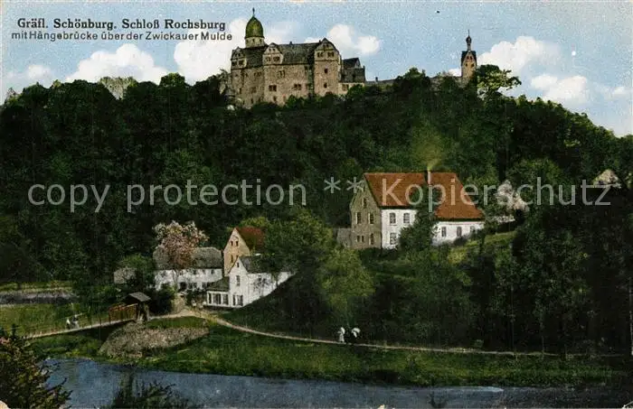 Rochsburg Teilansicht mit Schloss Haengebruecke ueber Zwickauer Mulde Rochsburg postalisch nicht gelaufen 1921-1965 Erhaltung siehe scans [FriedD77] Frierer