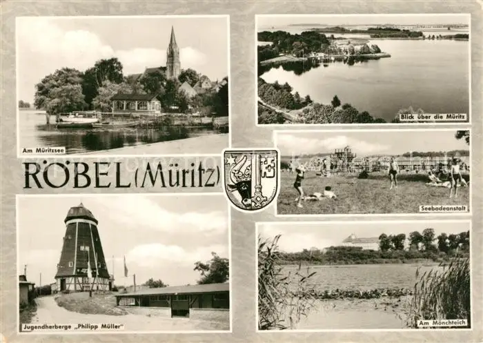 AK / Ansichtskarte Roebel_Mueritz Partie am Mueritzsee Kirche Seebadeanstalt Moenchteich Jugendherberge Philipp Mueller Roebel Mueritz