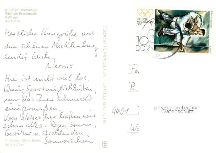 Roebel_Mueritz R.-Sorge-Oberschule Promenade Rathaus Hafen Mecklenburgische Seenplatte Roebel Mueritz postalisch gelaufen 1982 Erhaltung siehe scans [FriedD77] Frierer