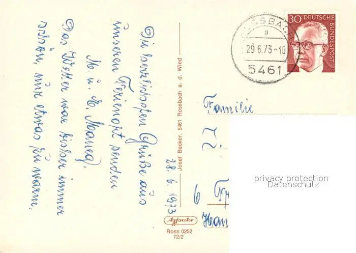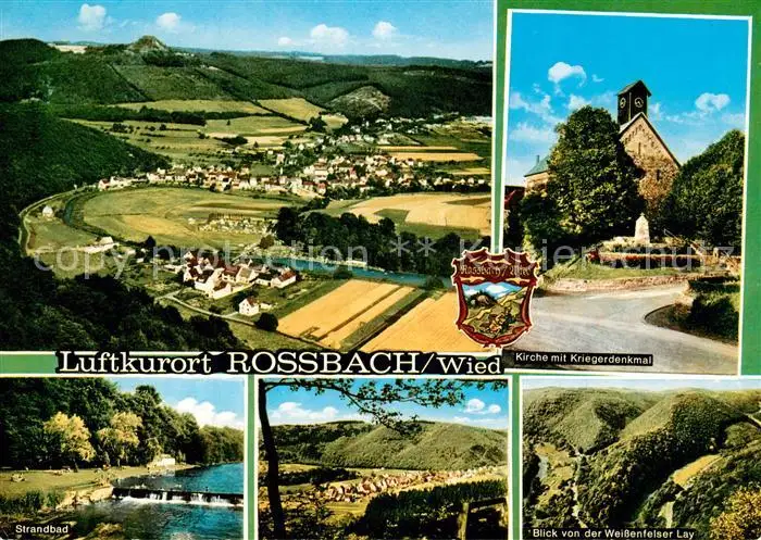 Rossbach_Wied Fliegeraufnahme Kirche mit Kriegerdenkmal Strandbad Blick von der Weissenfelser Lay Rossbach Wied postalisch gelaufen 1973 Erhaltung siehe scans [LiesaD40] LiesID40