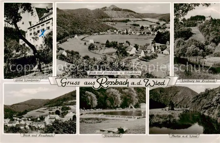 AK / Ansichtskarte Rossbach_Wied Hotel Wiedperle Panorama Walburg Teilansicht Strandbad Wiedpartie Rossbach Wied