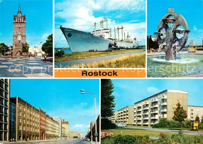 AK / Ansichtskarte Rostock_Mecklenburg Vorpommern Kroepeliner Tor Traditionsschiff Typ Frieden Suedstadt Wasserspiele Lange Strasse Pawlowstrasse Wohnblocks Plattenbauten Rostock