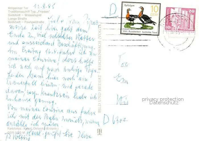 Rostock_Mecklenburg-Vorpommern Kroepeliner Tor Traditionsschiff Typ Frieden Suedstadt Wasserspiele Lange Strasse Pawlowstrasse Wohnblocks Plattenbauten Rostock postalisch gelaufen 1985 Erhaltung siehe scans [FriedD77] Frierer