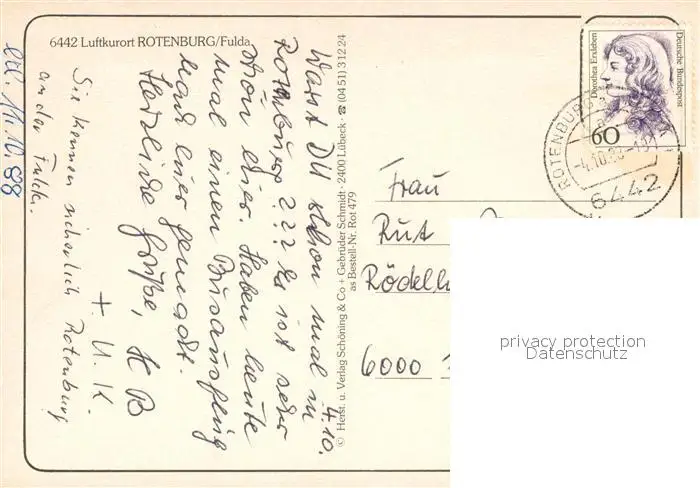 Rotenburg_Fulda Blick ueber die Fulda zur Altstadt mit Kirche Luftkurort Rotenburg Fulda postalisch gelaufen 1988 Erhaltung siehe scans [FriedD77] Frierer