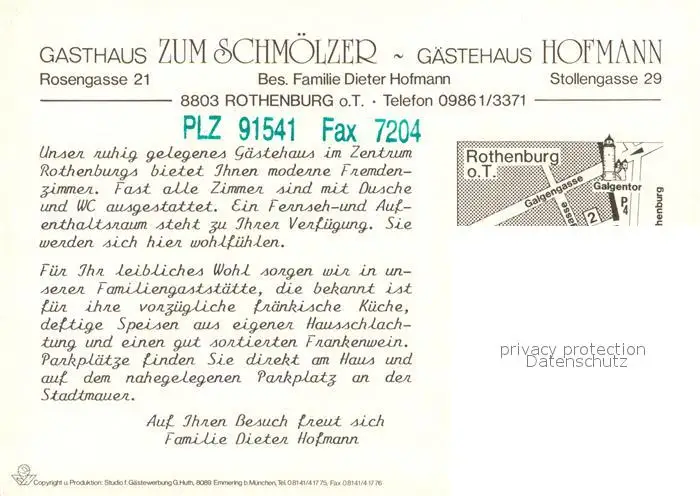 Rothenburg_Tauber Gasthaus Zum Schmoelzer Gaestehaus Hofmann Rothenburg Tauber postalisch nicht gelaufen nach 1965 Werbekarte (keine Postkarte) Erhaltung siehe scans [KathaD81] Werbekarte (keine Postkarte) Kathoren