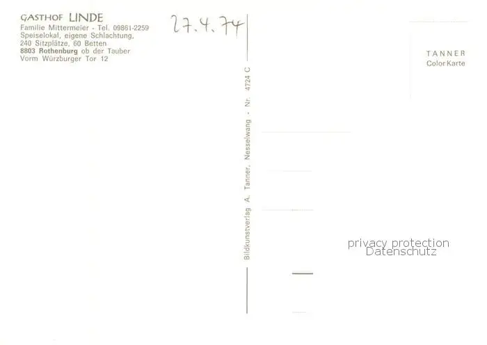 Rothenburg__Tauber Gasthof Linde postalisch nicht gelaufen 1974 Erhaltung siehe scans [FriedD77] Frierer