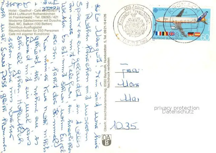 Rothenkirchen_Oberfranken Hotel Gasthof Hansveit im Frankenwald Gastraum Rothenkirchen Oberfranken postalisch gelaufen 1988 Erhaltung siehe scans [FriedD77] Frierer