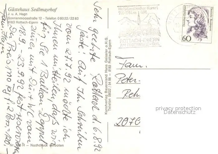 Rottach-Egern Gaestehaus Sedlmayrhof Rottach-Egern postalisch gelaufen 1992 Erhaltung siehe scans [WerneD78] WernPID7