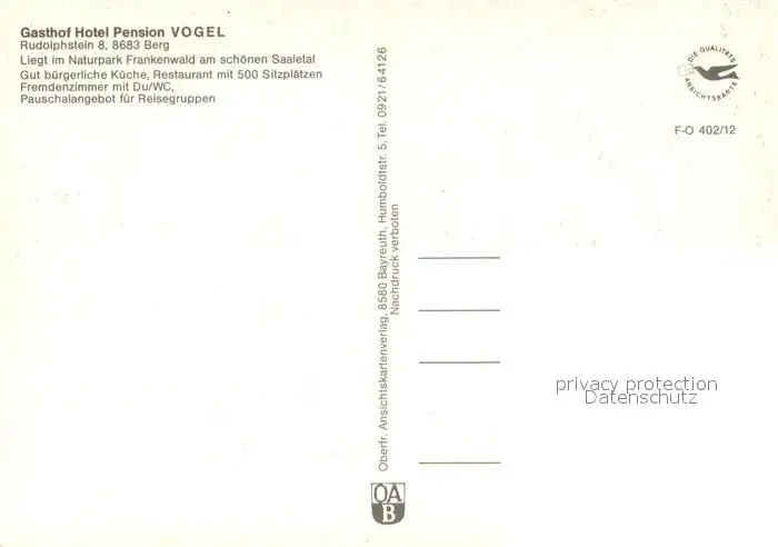 Rudolphstein Gasthof Hotel Pension Vogel Rudolphstein postalisch nicht gelaufen nach 1965 Erhaltung siehe scans [FriedD77] Frierer