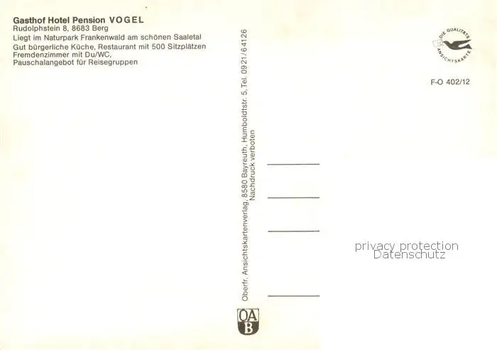 Rudolphstein Gasthof Hotel Pension Vogel im Naturpark Frankenwald Rudolphstein postalisch nicht gelaufen nach 1965 Erhaltung siehe scans [FriedD77] Frierer