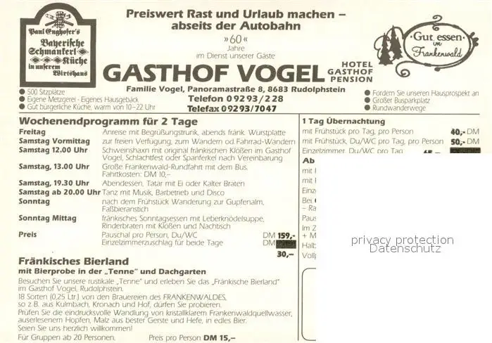 Rudolphstein Hotel Pension Vogel im Naturpark Frankenwald Saaletal Rudolphstein postalisch nicht gelaufen nach 1965 Werbekarte (keine Postkarte) Erhaltung siehe scans [FriedD77] Werbekarte (keine Postkarte) Frierer