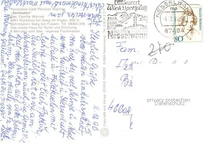 Rueckholz Panorama Café Pension Wanner Seeleuten Landschaftspanorama Alpen Rueckholz postalisch gelaufen 1996 Erhaltung siehe scans [FriedD77] Frierer