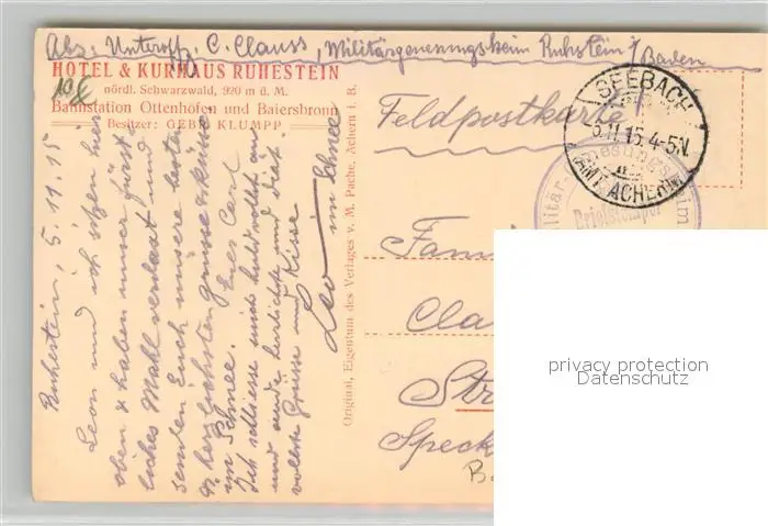 Ruhestein Hotel Kurhaus Ruhestein postalisch gelaufen 1915 Feldpostamt (Stempel) Erhaltung siehe scans [KathaD81] Feldpostamt (Stempel) Kathoren