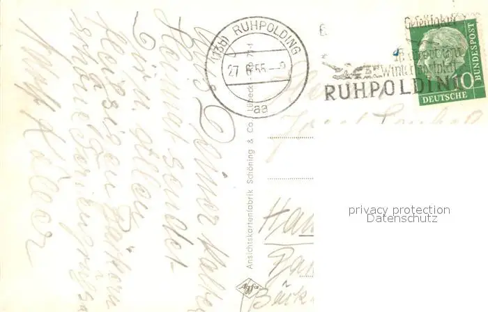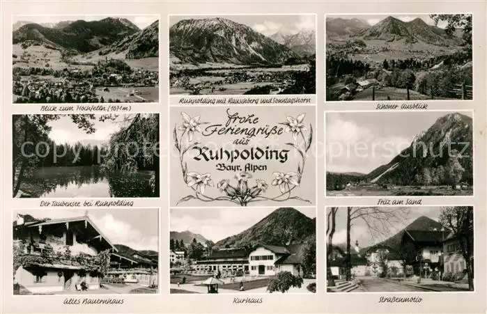 Ruhpolding Gesamtansicht mit Alpenpanorama Taubensee Altes Bauernhaus Kurhaus Strassenmotiv Fritz am Sand Ruhpolding postalisch gelaufen 1955 Erhaltung siehe scans [FriedD77] Frierer