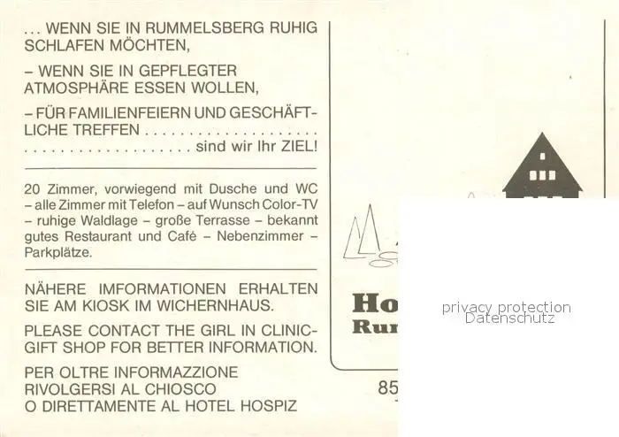 Rummelsberg Hotel Hospiz Aussenansicht m. Hotel-Informationen Rummelsberg postalisch nicht gelaufen nach 1965 Werbekarte (keine Postkarte) Erhaltung siehe scans [LiesaD40] Werbekarte (keine Postkarte) LiesID40