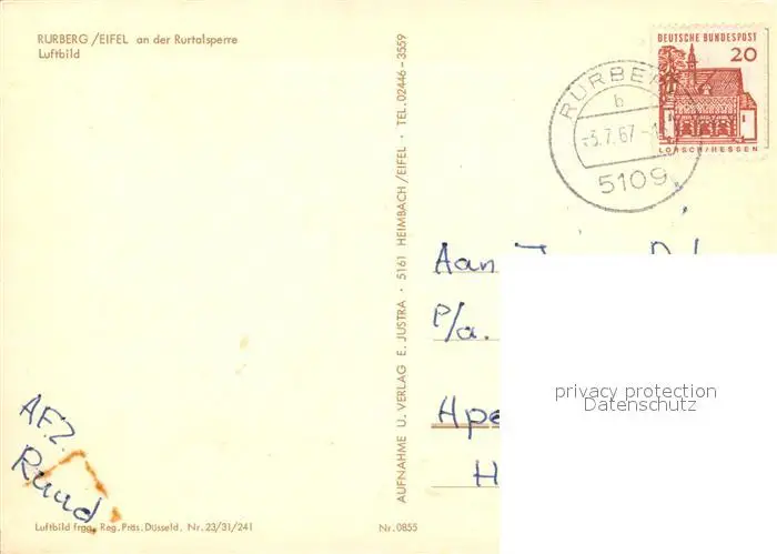 Rurberg Fliegeraufnahme mit Rurtalsperre Rurberg postalisch gelaufen 1967 Erhaltung siehe scans [WerneD78] WernPID7