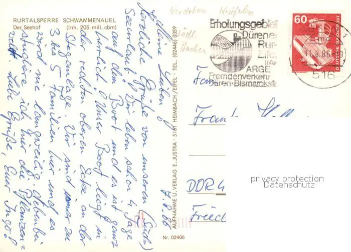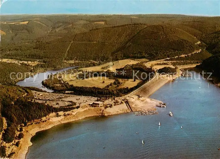 Rurtalsperre_Schwammenauel Fliegeraufnahme mit Der Seehof Rurtalsperre postalisch gelaufen 1986 Erhaltung siehe scans [WerneD78] WernPID7